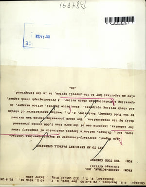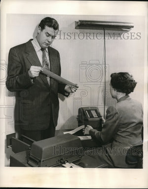 Nation's largest contractor of temporary labor industry was the Nugents-American Contractors, Inc. in Chicago, Jack Nugent, Secretary-Treasurer of the company as inspects one of the more than 2,000 checks processed daily by his organization. The check processing system was devised by the leading manufacturer of check and check writing equipment, the Todd Company. Photo shows Miss Bette Segreti, Office Manager, is operating a Protectograph check writer which is the key to the payroll system.