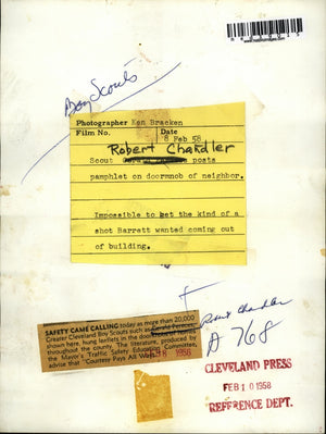 1958 Press Photo Scout Robert Chandler post pamphlet on door knob of neighbor