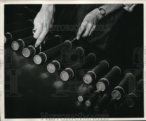 High voltage electric fuses at the East Pittsburgh Works of the Westinghouse Electric and Manufacturing Company. The pattern of this hight voltage fuses and the position taken by hands of the testman suggest the action of a xylophonist in the orchestra.