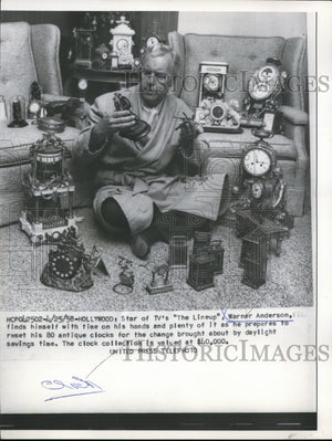 1958 Press Photo Warner Anderson Resets His 80 Antique Clocks