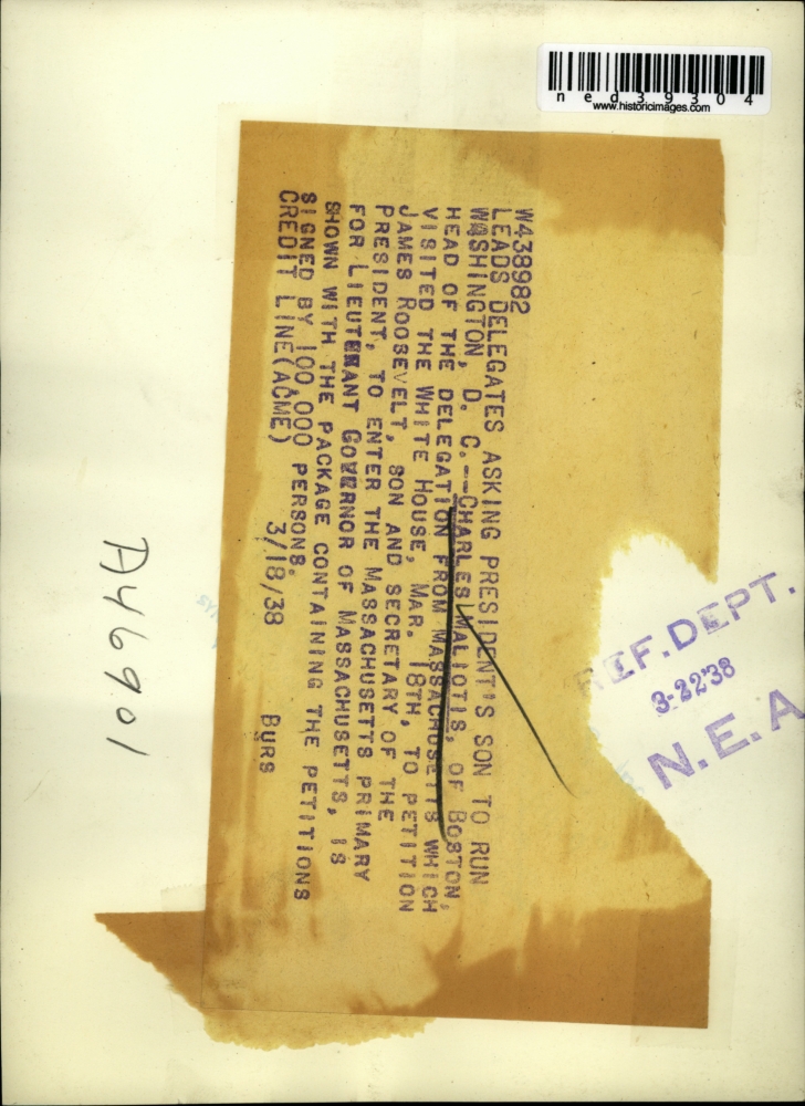 Charles Maliotos of Boston head of the delegation from Massachusetts which visited the whitehouse, Mar 18th to petition James Roosevelt, son and secretary of the President to enter the Massachusetts primary for lieutenant Governor of Massachusetts, is shown with the package containing the petitions signed by 100,00 persons