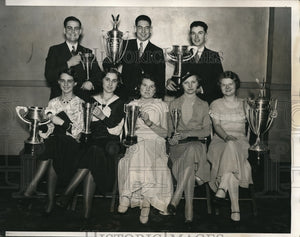 their cups following the Annual Banquet of the Club at the Hotel Sherman in Chicago pictured are Maurine Knoyse, Wanita Gutherie, Mildred Startup, Frances Maegoo, Ross Allen, Donald McDowell, and Vernon L Baldwin