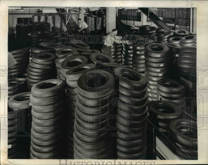 Picture of two warehouse men of the Firestone Plant at Akron, stacking the tires in the shipping room, making them ready for delivery to the civilian market as the production begun to flow off.