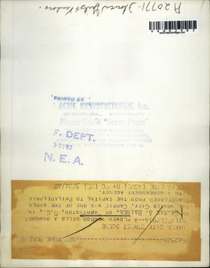 Photo shows a flower vendor sells a bouquet to Carrie A. Haines, one of the girls transferred from the Capital to Philadelphia with a government agency.