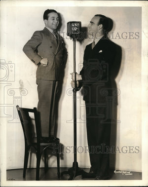 Jackie (Half-print) Heller, 5"1 tenor protege of Ben Bernie's and Norman (Stretch) Cordon, 6"5 basso with the NBC Ambassador Quartet, demonstrate the long and short of the artist staff in Chicago NBC Studios. Jackie is hear on air each Wednesday at 8:45 pm and Friday at 10:15 pm over an NBC-WJC Network. Norman and the ambassadors are on the air each Tuesday, Wednesday and Saturday at 3:30 pm over an NBC-WJC Network.