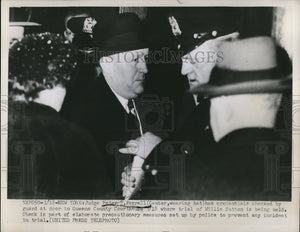 1952 Press Photo Peter Farrell has credentials checked by the guard at door