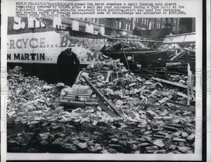 1956 Press Photo Don Smith Examines Collapsed Foreign Auto Shop