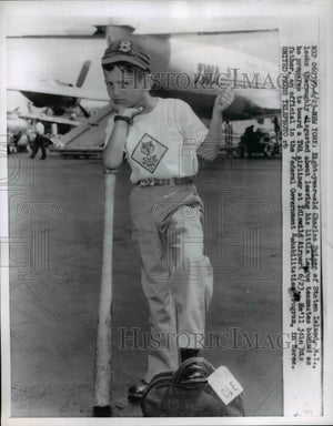 Photo shows the 8-year-old Charles Spiser looks thoroughly disgusted about leaving his Little League teammates behind as he prepares to board a TWA Airliner at Idlewild Airport. He'll join his father an official in the Federal Government Rehabilitaion Program in Korea.