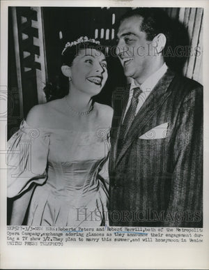 Roberta Peters and Robert Merrill both of the Metropolitan opera exchange glances as they announce their engagement.