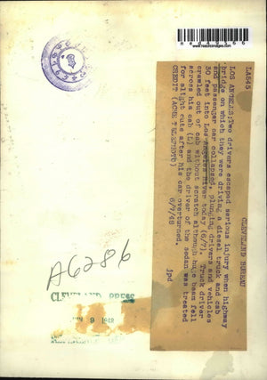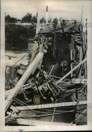 Photo shows two drivers escaped serious injury when highway bridge on which they were driving a diesel truck and cab and passenger car collapsed, plunging drivers and vehicles 30 feet into Los Angeles River. Truck driver crawled out of cab without scratch although huge beam fell for slight cuts after his car overturned.
