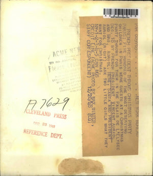 Christmas Party for 500 deserving children in Paris given by French President Vincent Auriol and Mrs. Auriol. Photo shows Santa and Pres. Auriol ask 2 little children what they want for christmas