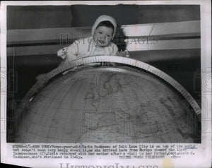 Three year old Carla Bushness is on top of the world but doesn't seem very happy about it, as she arrived from Europe aboard the liner Independence. Carla returned with her mother after a visit to her father, Capt. Clark O. Bushness, who's stationed in Italy.