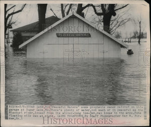 1949 Press Photo Peaceful water sign painted at Sugar Lake where there is flood