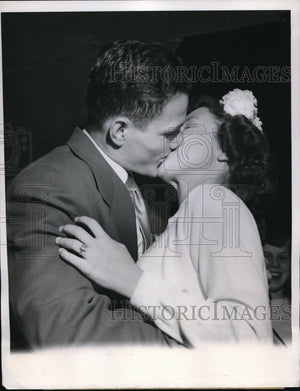 1951 Press Photo Champaign Ill Betty Hughes receives kiss from DOn Sunderlage