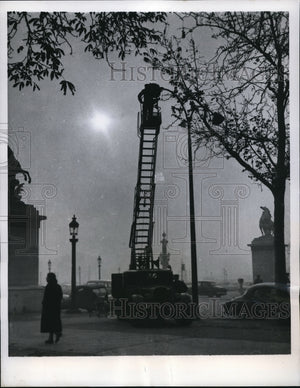 1957 Press Photo Paris a workman is cleaning a street lamp on the Place De La