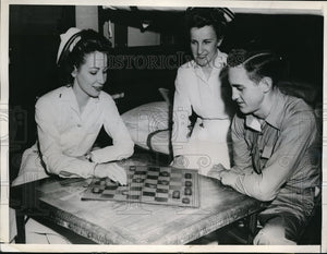 1945 Press Photo Marine Sgt. Robert J Figgins playe checkers with Navy Nurses.