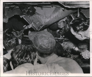 1951 Press Photo Rescue crew peers through a gaping hole of a wrecked car
