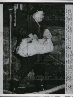 1952 Press Photo A firefighter carries the body of two year old Carole Horn