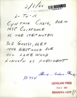 1960 Press Photo Cynthia Craig, Bob Grossi, Child Actors In Lincoln Play