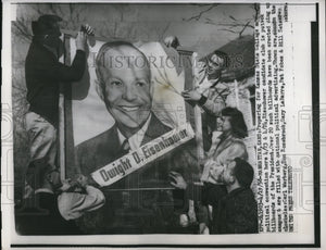 President Eisenhower preparing for Kansas State College. Over 20 such billboards have been erected to the campus and are filled with National Political Advertising. In the photo are Carl Warberg, Don Rosebrook, Gary LaBarre, Pat Fobes, and Bill Setsekorn.