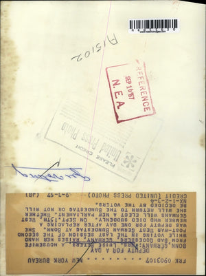 Photo shows Mrs. Luise Peters, a housewife, raises her hand while voting in the last session of the second post-war West German Bundestag. She was Deputy for one day after replacing a member who died suddenly.