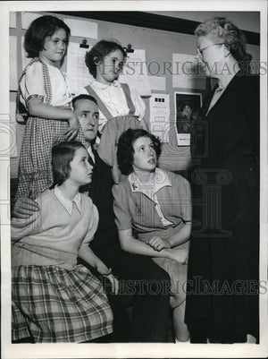 1946 Press Photo John Hickey with his daughters talks to teacher Katherine Crain