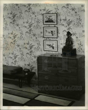 1958 Press Photo Oriental garden patterned wallpaper on display