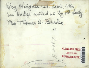 1952 Press Photo Roy Wingate Has Badge Pinned by Mrs. Thomas A. Burke