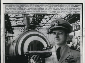 Groton. Conn: Lt.Cmdr. William W. Behrans Jr., Skipper of the Atomic powered sub Skipjack examines a model of the NAvy's 1st submarine, USS Holland