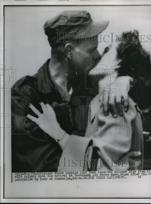 Photo shows Air Force Captain Zack Dean receives welcome kiss from his wife, Abigail upon his arrival at Tachikawa Air Force Base, Japan after his repatriation by Reds at Panmunjom, Korea.
