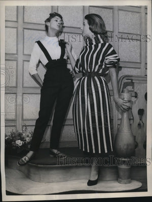 Paris- After-ski clothes by Andre Ledoux are designed to keep warm and fashionable. Suspender pants in black and grey wool feature little pockets under the shoulder straps and one on the straps itself. And the other model wearing turtle-necked dress made of heavy jersey in red ,black and white.