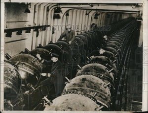 Scores of mines, lined up in the hold of a British Mine-layer which is sowing the explosives-laden spheres to create a floating rampart in the North Sea.