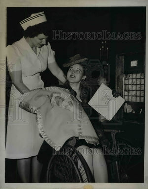 Photo shows nurse Virginia Oelrich and Mrs. James Dow holding 9-day-old Louis Dow II, and Mrs. Louis May, judge of election.