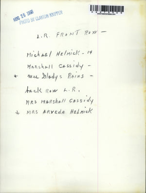 L-R front row: Michael Helmick, 14, Marshall Cassidy, Miss Gladys Rains back rows L-R: Mrs. Marshall Cassidy and Mrs. Arveda Helmick