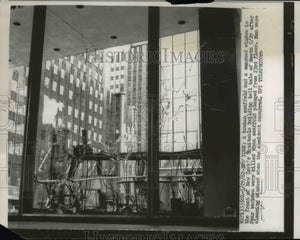 1962 Press Photo A broken scaffold and smashed window in front of New York