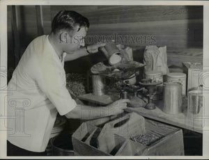 1937 Press Photo A man weighing a chinchillas food rations at his farm