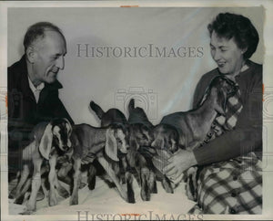 1950 Press Photo Mr. and Mrs. Frank Corbus nursing their quintuplet goats