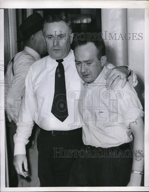 Chicago police lieutenant James McMahon, left, aids Mr. Leo Rausch as he leaves coroner's room following identification of the body of his son, Leo, Jr., 8 years old. The boy, missing from home for 13 days, was found dead in the Chicago River on Mother's Day while his mother was at church praying for his safe return. Fifty police were on a full-time detail searching for the boy who eluded them in what proved to be a fatal game of hide-and-seek.