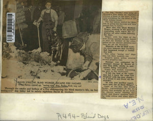 Through the smoke and bedlam of a fire endangering his blind master's life, an heroic "seeing-eye" dog led to safety sightless David H. Strelow.