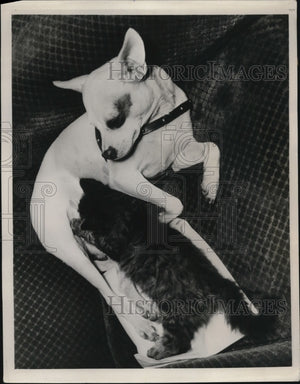 1940 Press Photo Tiny, a fox terrier, feeding the kitten Scatter-brain