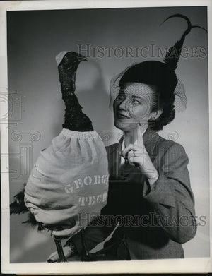 1949 Press Photo of Patricia Stevens inspecting the best dressed turkey from the
