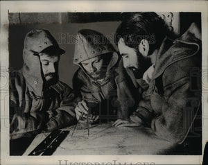Three duffel-coated officers known as the (left to right) lawyer, bank manager and the author has chart their corvette course in response to Hitler's threat of an intensified submarine warfare.