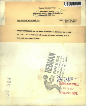 1957 Press Photo Unique candelabra in the Main Sanctuary of Fairmount Temple