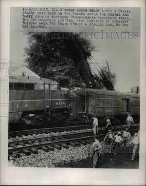 1950 Press Photo Crane Lifts Diesel Train Engine Indianapolis Limited onto Track