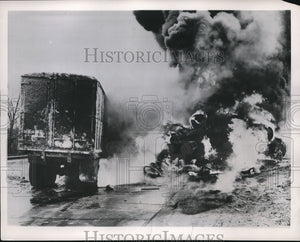 1933 Press Photo Michigan City Ind burning wreck if gas tanker truck