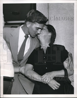 1953 Press Photo Robert Toth getting a kiss from his mother Nettie Mertz
