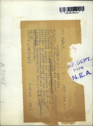 Olympia, Washington- 37-year-old Hugh B. Mitchell (right) has an appointment with the United States Senate while 39-year-old Senator Warren G. Magnuson congratulates.