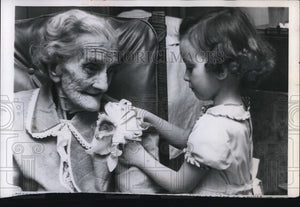 Cincinnati- Janet Marie Kleimeyer, age 4 and half pins an orchid on her great-great-grandmother, Mrs. Alice Osborne at Drake Memorial Hospital since she fractured her hips.