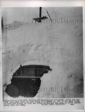 1958 Press Photo Half buried car and telephone pole in snow, Soda Springs, Nevad