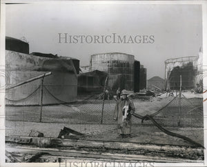 1938 Press Photo Fireman at Scene of Cities Service Refinery Plant Catches Fire
